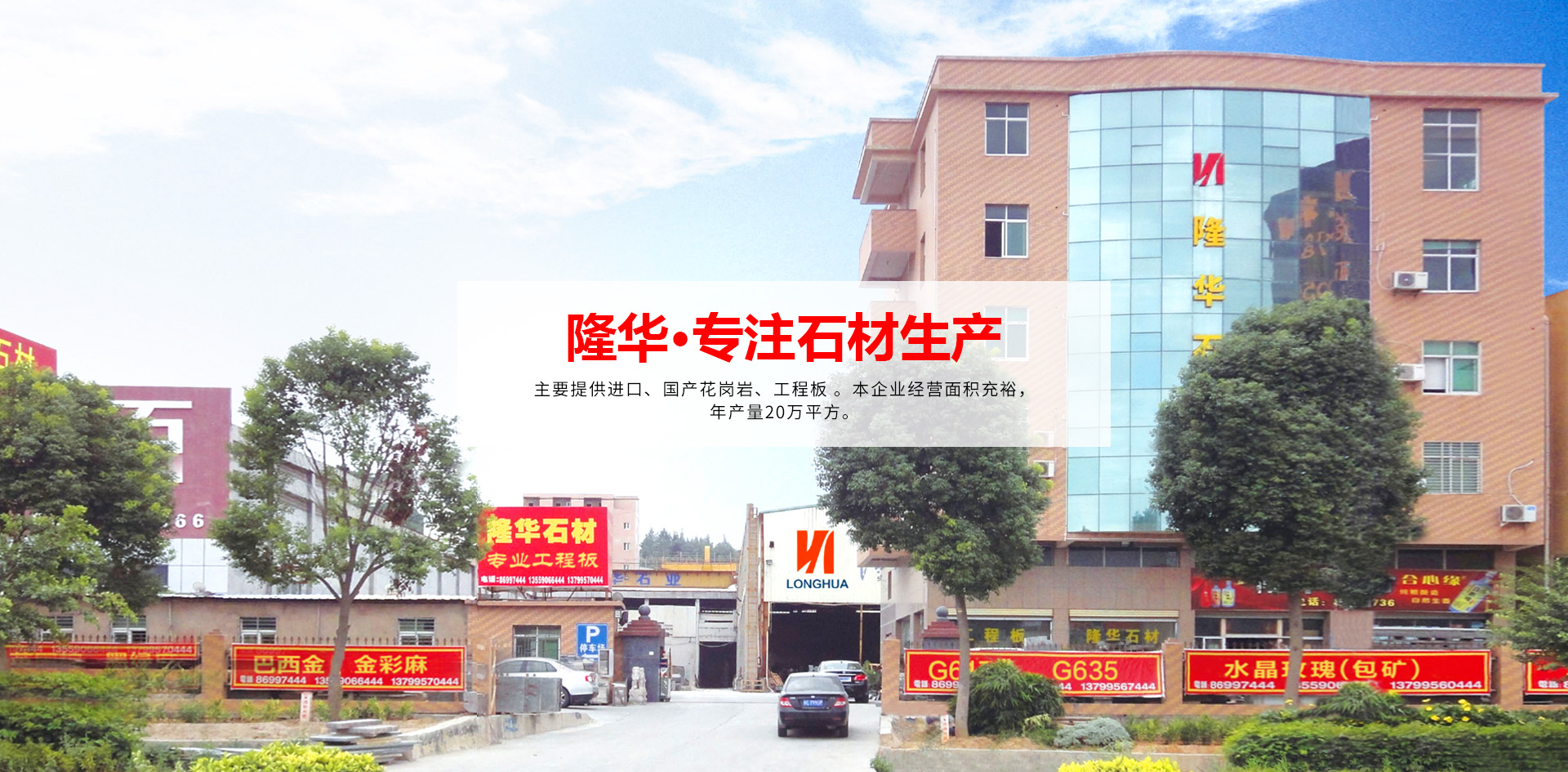 ??福建省南安市隆華石材有限公司注冊資金3000萬元人民幣,位于位于素有“石材之鄉(xiāng)”美譽的福建省南安市水頭西錦工業(yè)區(qū)康利對面,地理位置優(yōu)越。公司主要加工銷售各種花崗巖石材及大理石精加工,具備生產(chǎn)供應圓形、異型、平板、薄板等工藝石品的綜合能力,設備配套齊全。目前已配備橋切機多臺,全自動磨光機2臺,紅外線切邊機多臺,行吊多臺,叉車多部,擁有繩鋸、線條機、雕刻機等齊全的配套設備及相關的完善供配電系統(tǒng)、機械維修設備等。